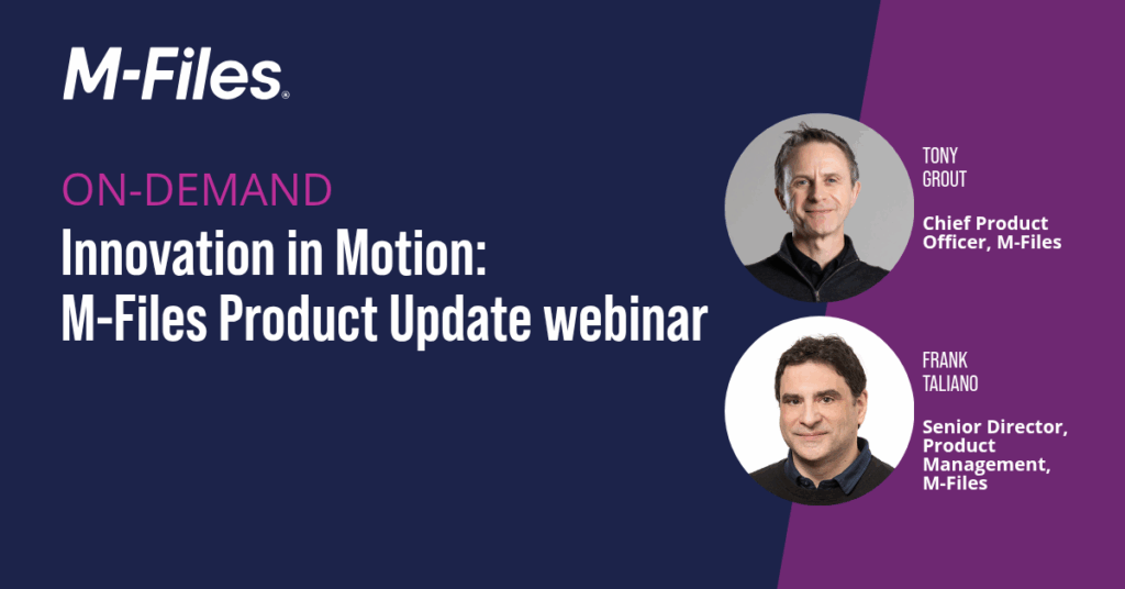 M-Files Events Country Country CountryAnyGlobal Events (1)Virtual Events (1) Date Date DateAny2025-12-09 (1) Webinar | Transforming Financial Services Enterprise with M-Files + Microsoft 365 Germany Currently no events are available. France Currently no events are available. On-Demand Webinars Webinar | Innovation in Motion: M-Files Product Update Event Date: On-Demand AI-Driven Manufacturing with M-Files + Microsoft 365 Event Date: On-Demand Webinar | A Deep Dive: Unlocking the Power of M-Files and Microsoft 365 partnership Event Date: On-Demand Webinar | M-Files Cloud + Microsoft: Benefits and Capabilities with your Microsoft 365 Investment Event Date: On-Demand Webinar | M-Files & Microsoft 365: The Perfect Match Event Date: On-Demand Webinar | Innovation in Motion: M-Files Product Update Event Date: On-Demand