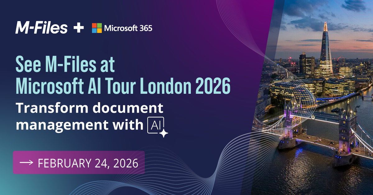 M-Files Events Country Country CountryAnyUnited Kingdom (1)United States (1) Date Date DateAny2026-01-21 (1)2126-02-24 (1) Microsoft AI Tour New York CityMicrosoft AI Tour London 2026, Transform document management with AI Germany Currently no events are available. France Currently no events are available. On-Demand Webinars Webinar | Innovation in Motion: M-Files Product Update Event Date: On-Demand AI-Driven Manufacturing with M-Files + Microsoft 365 Event Date: On-Demand Webinar | A Deep Dive: Unlocking the Power of M-Files and Microsoft 365 partnership Event Date: On-Demand Webinar | M-Files Cloud + Microsoft: Benefits and Capabilities with your Microsoft 365 Investment Event Date: On-Demand Webinar | M-Files & Microsoft 365: The Perfect Match Event Date: On-Demand Webinar | Innovation in Motion: M-Files Product Update Event Date: On-Demand