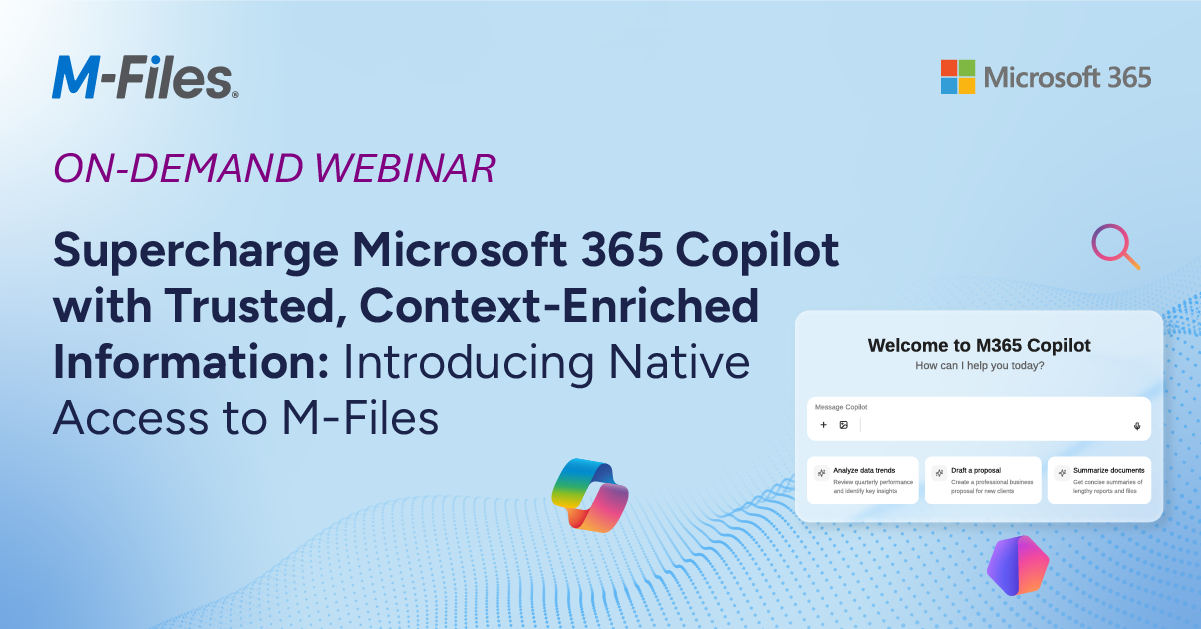 Kokeile M-Filesia ilmaiseksi 30 päivän ajan! Tutustu M-Files Ainon GenAI-ominaisuuksiin, tehosta yhteistyötä kollegoiden kanssa, automatisoi työnkulkuja ja avaa ovet loputtomiin mahdollisuuksiin.
